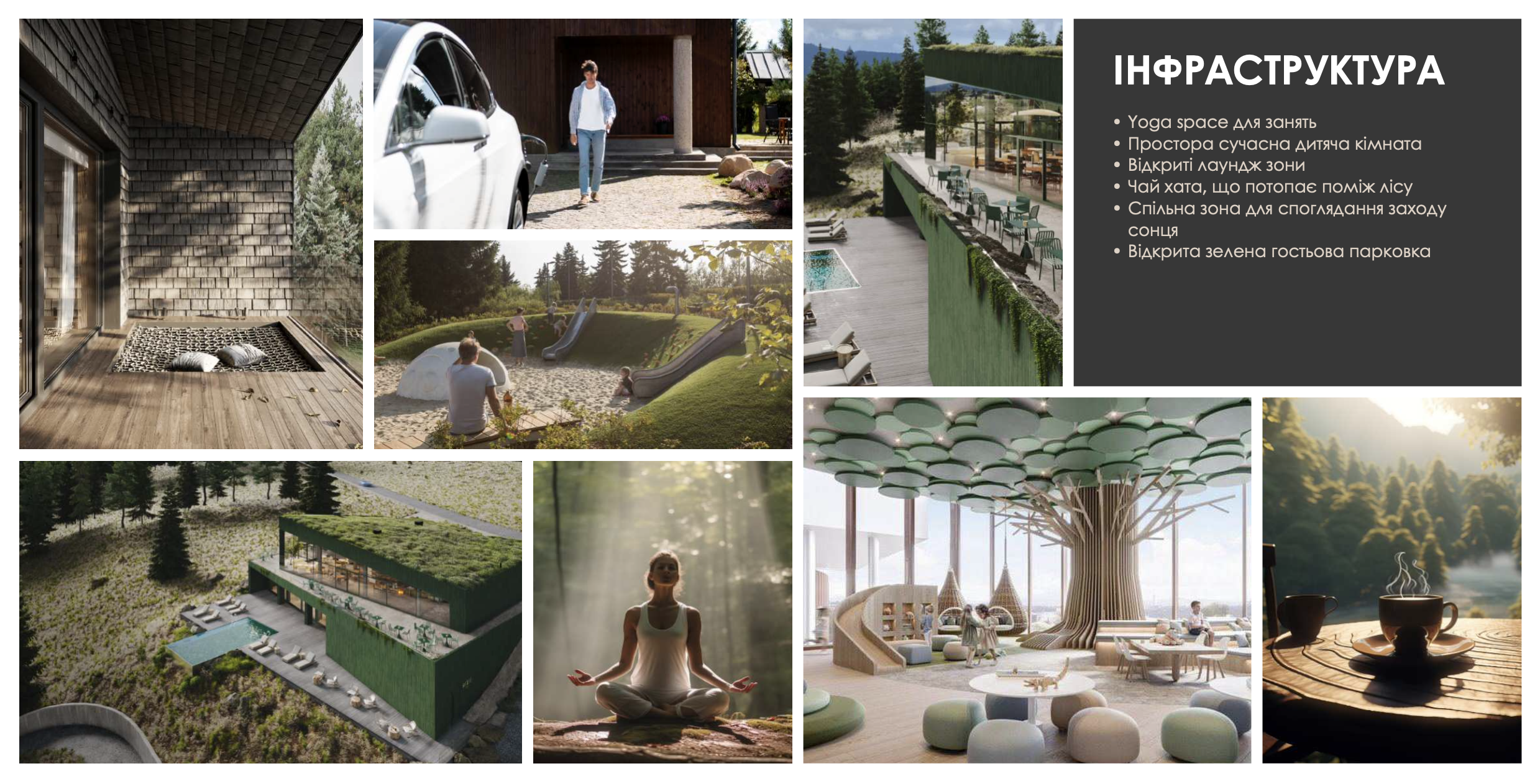 Територія вже є магічною та дивовижною, бо саме тут відбувається органічне злиття з природою. Хатинки, наче теплі світляки у загадковому лісі. Чани, сауни, розкидані територією в повному поєднанні з тишею, видами та природою. Зони з вогнищем між декількома будиночками. Наша історія про потаємну втечу від усього світу, про приховане, загадкове, дивовижне, що має продовження в інтер’єрі готелю, при кожному дотику з гостем, нагадує про головні посили та сенси.